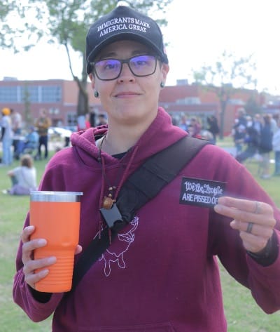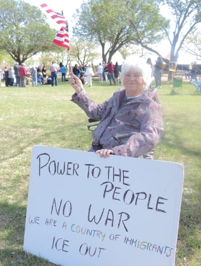 Gudrun Tendall was one person in attendance at the event, adorned with an American flag and a sign reading, “Power to the people! No war! We are a country of immigrants! Ice out!” Even needing a walker, Tendall made a point to show up to the event and make her voice heard. She explained that she’s frustrated that the three branches of government seem to have dissipated in the current state of things. She also expressed frustration over what she described as corruption within the government, explaining that everyone at that level is behaving as if they’re above the law.