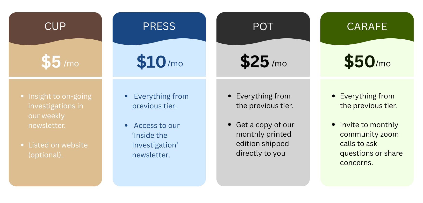 Below you can see a graph of all the different membership tiers and what you get in return. Every membership helps Dark Roast’s mission in sharing the stories that often go overlooked.
