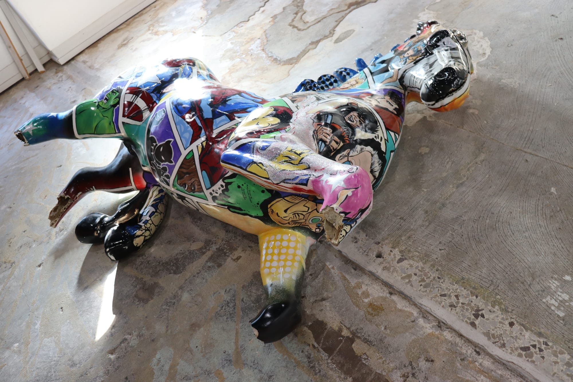 On the morning of April 18, it was announced that one of the favorites of the statues, “Choose your Side”, was vandalized. The large fiberglass horse covered in comic panels had been beaten until the body was removed from the legs, leaving it laying on the ground. This particular statue was designed by Amy Walker and her daughter, Madison Gerber, the owners of Withershins Menagerie.